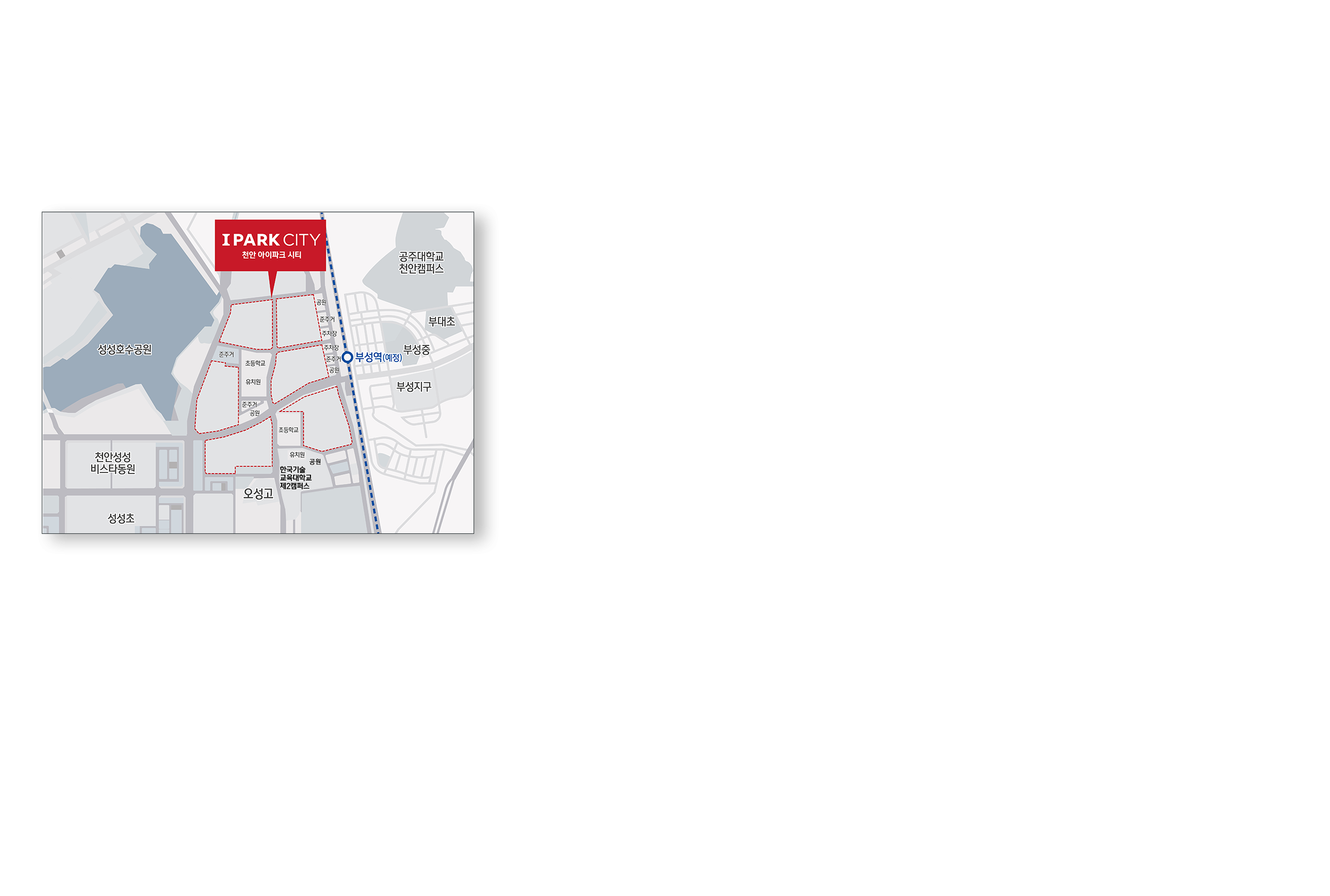 부성역(예정)과 접근성이 뛰어난 역세권 단지이며IPARK CITY 내의 초등학교, 유치원 및 준주거시설 등
